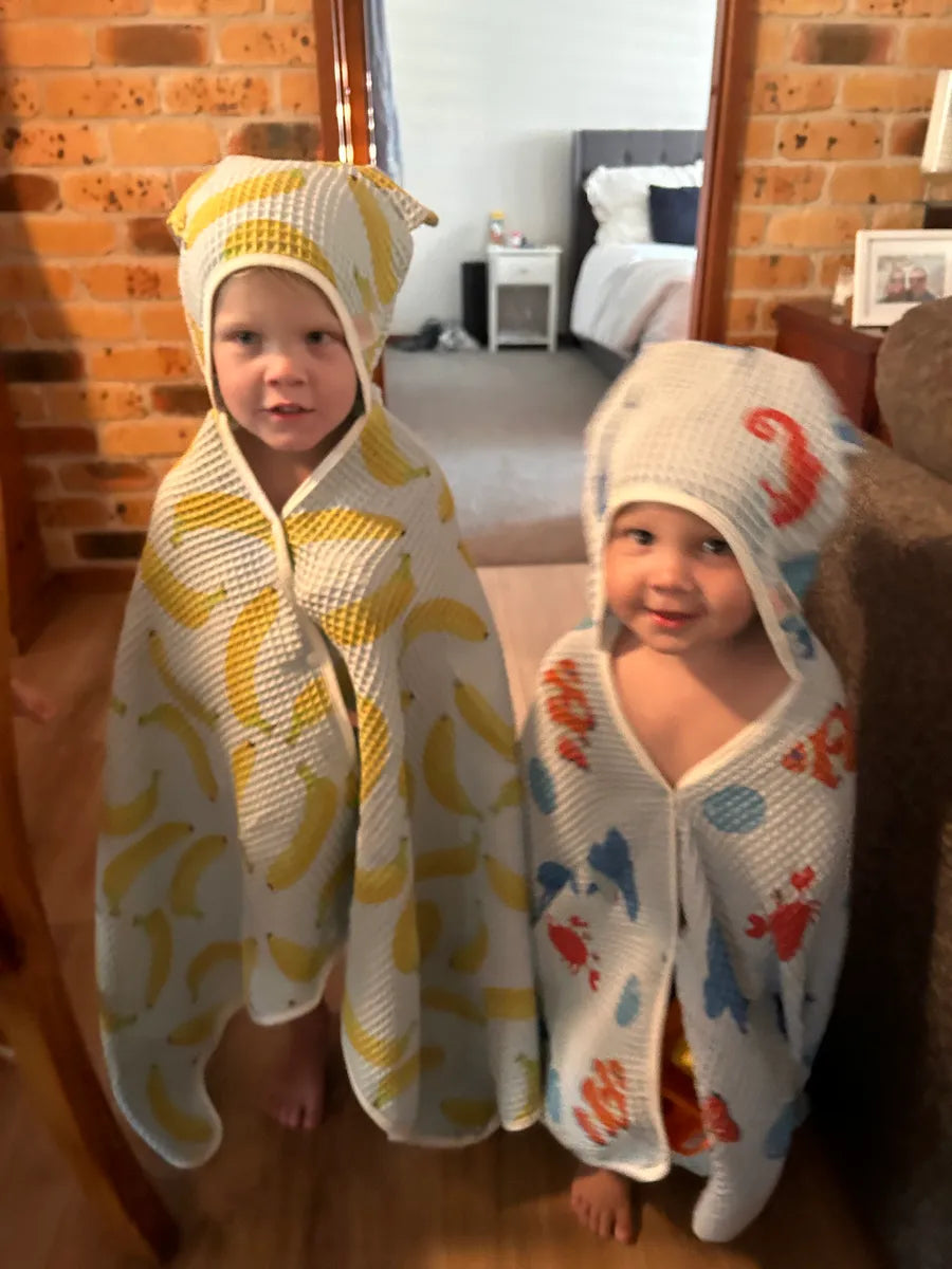 Best kids towel ever!Super cute toddler towel with button down front and hood. Stops my little one getting cold as she runs around after the bath and pretends to be a strawberry. Buying so many as gifts as you can't go wrong with a strawberry, vege or banana towel Hayley T