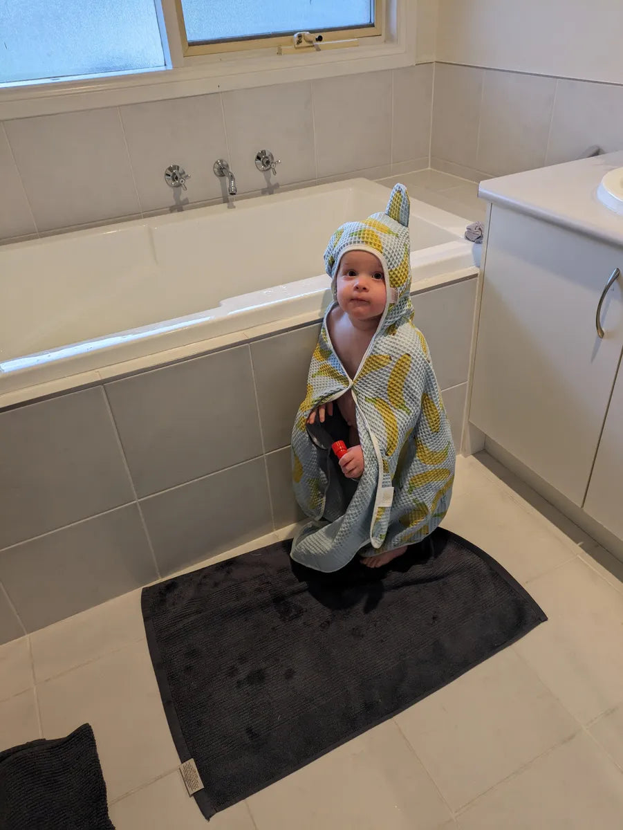 Love love love this productThis kids towel is by far the BEST on the market!! The waffle cotton is truely unique, soft, light weight and SUPER absorbent !! The hood fit perfectly not too big or small and the inset glove .. GENIUS! Both my 3 and 18 month old love the button up wrap around .. cozy and doesn’t fall off!!!! And the ears 🥰🥹 just to make our little ones look even more adorable post bath! Cant rate this product more! Nothing else like it on the market! Too frickin cute!! Juliana P